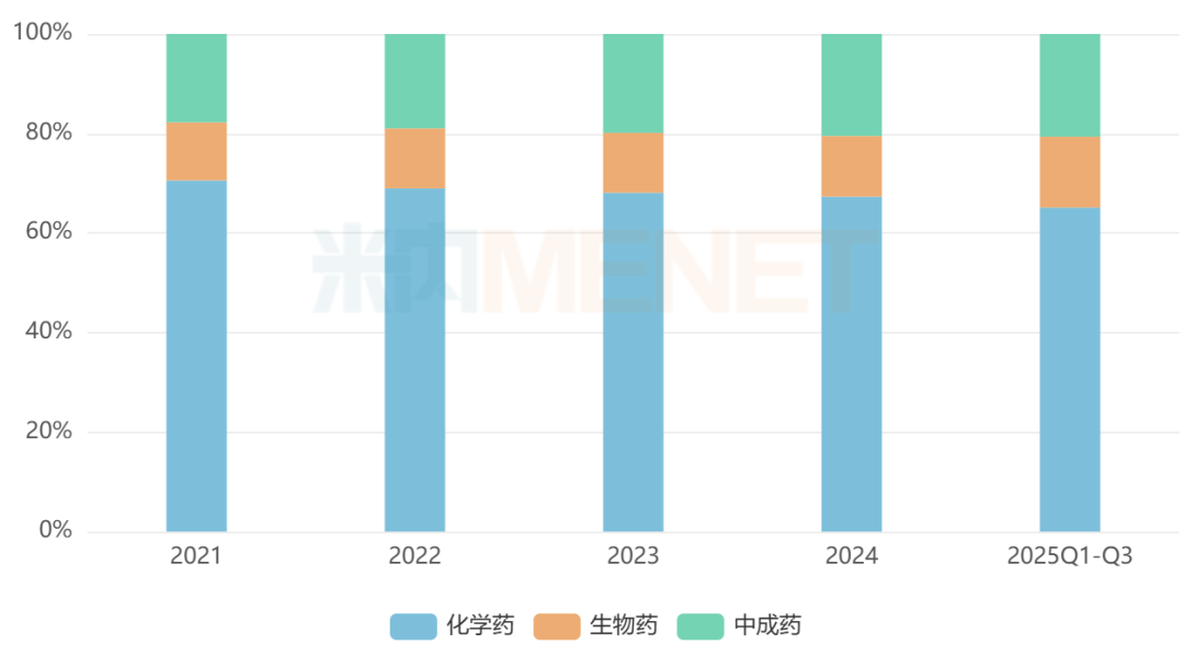 2025Q1~Q3药品类型格局方面,化药仍为主力军,市占比超过65%;中成药市占比超20%,呈稳步扩容之势;生物药市占比超14%,比2024年提升了2个百分点。