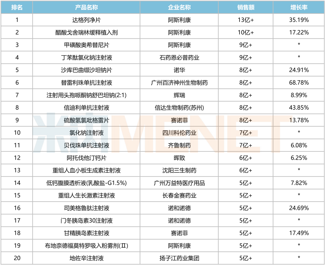 化药及生物药TOP20品牌中,阿斯利康的达格列净片、醋酸戈舍瑞林缓释植入剂和甲磺酸奥希替尼片包揽前三,石药集团的丁苯酞氯化钠注射液、诺华的沙库巴曲缬沙坦钠片分别位列第四和第五。TOP5品牌销售额均在8亿元以上。