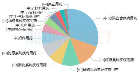 从中成药大类格局上看,心脑血管疾病用药稳守第一,市场份额超过30%;呼吸系统疾病用药、骨骼肌肉系统疾病用药分别以超14%和10%的份额位居其后。