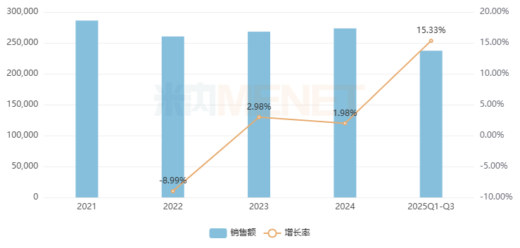 在中国三大终端六大市场(统计范围见文末),消化系统及代谢药(化+生)的市场规模在2022-2024年持续下滑,但仍保持在2100亿元区间,2025年Q1-Q3止跌回升2.78%,销售额已超过1600亿元。