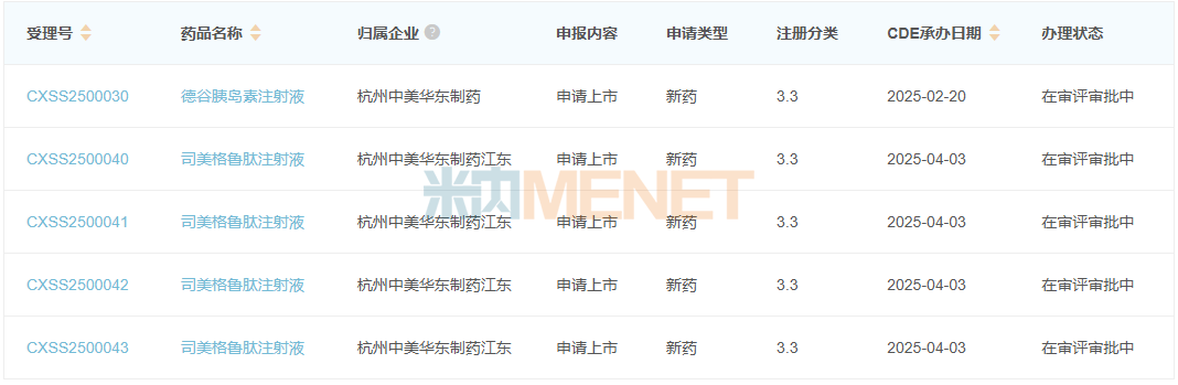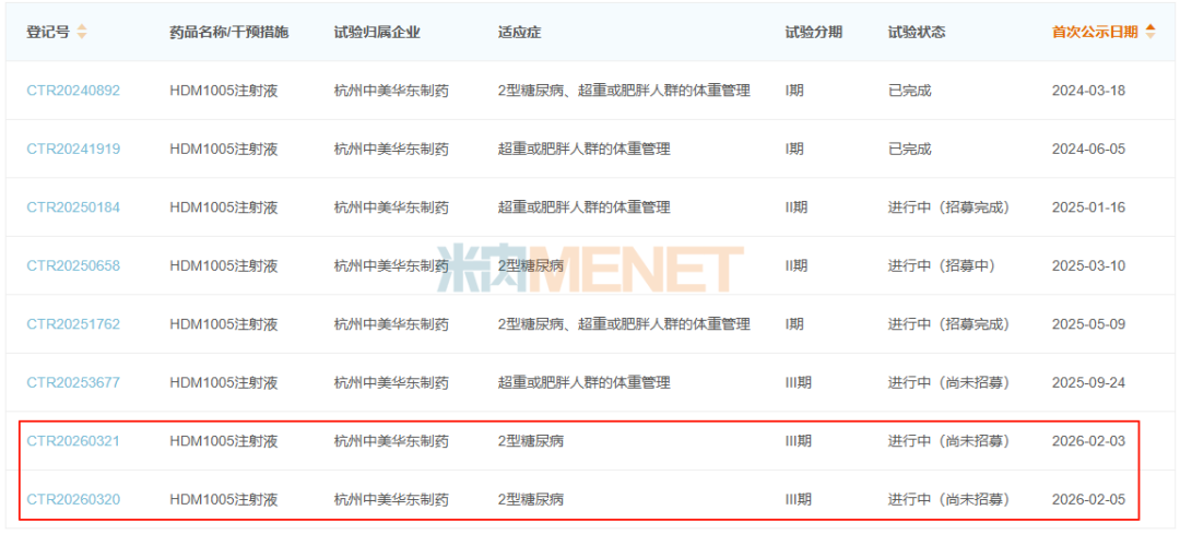 HDM1005注射液是一款GLP-1R/GIPR双靶点长效多肽类激动剂,最早在2024年3月获得临床批件。据华东医药2025年三季报资料显示,该新药已于去年10月完成了体重管理适应症III期临床首例受试者入组。米内网数据显示,HDM1005注射液于2026年2月启动了2型糖尿病的III期临床。