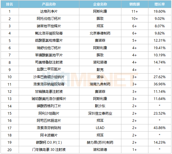 正增长品牌中,12个有双位数增速,LEAD的洛索洛芬钠贴剂大涨43.86%、湖南九典制药的洛索洛芬钠凝胶贴膏大涨36.96%、诺华的沙库巴曲缬沙坦钠片大涨27.62%、深圳信立泰药业的阿利沙坦酯片大涨23.52%,此外,阿斯利康的达格列净片和瑞舒伐他汀钙片、赛诺菲的硫酸氢氯吡格雷片等大涨超过10%。