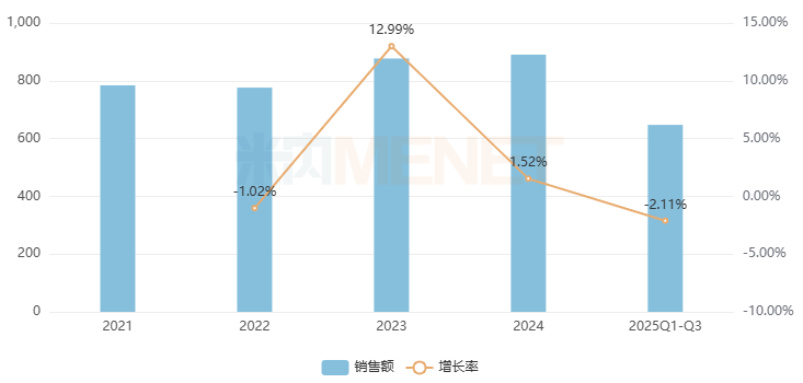 米内网数据显示,近年中国城市社区市场跌宕起伏,2023年-2024年均超过800亿元销售规模,2025年Q1-Q3同比有所下滑。
