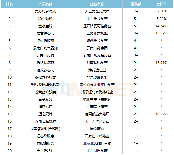 正增长品牌中,上海和黄药业的麝香保心丸、河南羚锐制药的通络祛痛膏、德国凯旋大药厂的迈之灵片等增速均超过10%,天士力医药集团的复方丹参滴丸、山东步长制药的稳心颗粒增速均超过5%。