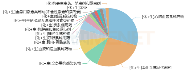 从化药及生物药大类来看,心脑血管系统药物、消化系统及代谢药、全身用抗感染药物位居前三,合计市场份额超过65%。抗肿瘤和免疫调节剂增速最快,同比增长近15%;其次是感觉系统药物,同比增长11.76%。