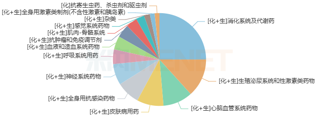 从化药及生物药大类来看,消化系统及代谢药、生殖泌尿系统和性激素类药物、心脑血管系统药物位居前三,合计市场份额占比超过50%。全身用抗感染药物增速最快,达119.12%;心脑血管系统药物、血液和造血系统药物、抗肿瘤和免疫调节剂、杂类增速均超过50%。