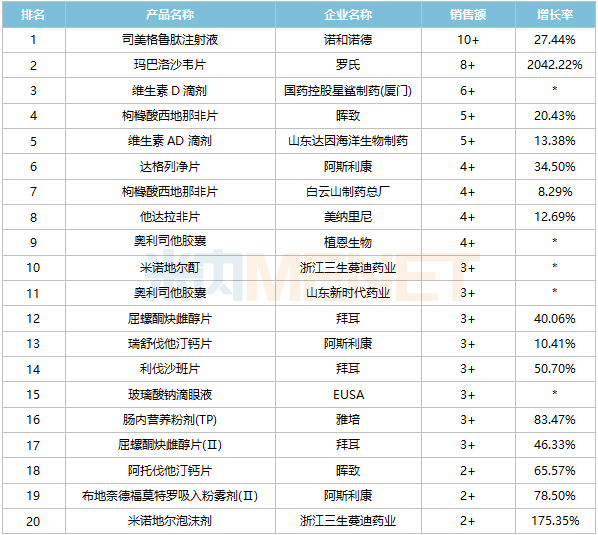 化药及生物药TOP20品牌中,诺和诺德的司美格鲁肽注射液以超过10亿元继续稳居“销冠”宝座,罗氏的玛巴洛沙韦片、国药控股星鲨制药(厦门)的维生素D滴剂分别位居第二、第三,销售额超过8亿和6亿元,晖致的枸橼酸西地那非片、山东达因海洋生物制药的维生素AD滴剂销售额均超过5亿元。