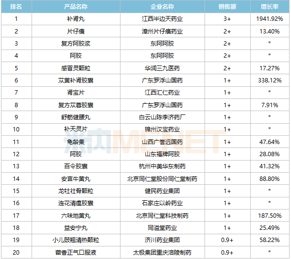 中成药TOP20品牌中,江西半边天药业的补肾丸、漳州片仔癀药业的片仔癀、东阿阿胶的复方阿胶浆和阿胶、华润三九医药的感冒灵颗粒位居前五,销售额均超过2亿元;广东罗浮山国药的复方苁蓉胶囊、山西广誉远国药的龟龄集、山东福牌阿胶的阿胶等销售额均超过1亿元。