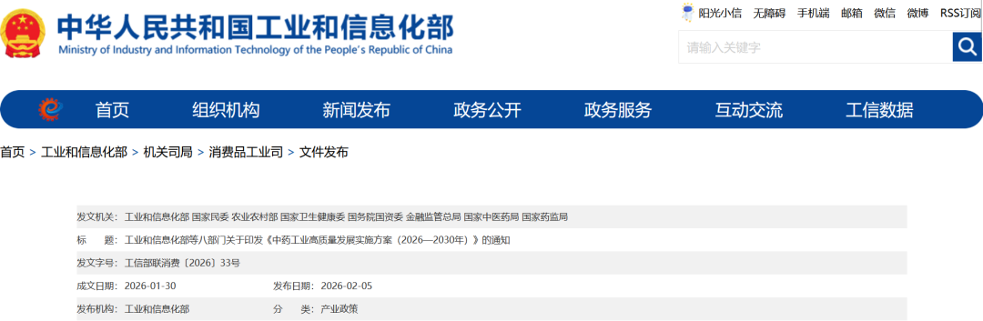 2026年2月5日,工业和信息化部等八部门发布《中药工业高质量发展实施方案(2026—2030年)》,为“十五五”时期中药工业高质量发展立标定向、领航赋能。