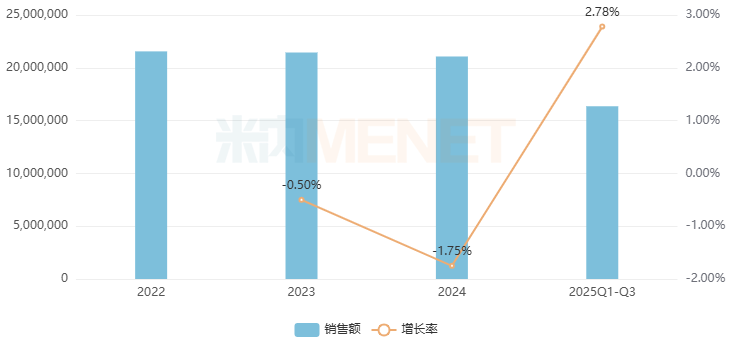 舒地胰岛素注射液为国内首个自主研发的长效胰岛素类似物,拟用于2型糖尿病;HRS9531注射液为国内首个自主研发的GLP-1/GIP双受体激动剂,拟用于糖尿病、减重等。两款新药均属于消化系统及代谢药,该品类2022-2024年在中国三大终端六大市场(统计范围详见本文末)销售额均超2100亿元,2025Q1~Q3以2.78%的增速增至超1600亿元。