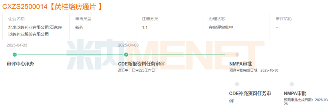 芪桂络痹通片是以岭药业的的中药1.1类新药,具有祛风散寒除湿、蠲痹通络止痛的功效,主治类风湿关节炎风寒湿痹证。该新药针对的病症包括肢体关节肿胀、疼痛、晨僵,关节屈伸不利、活动受限等,为患者提供了新的治疗选择。米内网数据显示,芪桂络痹通片已于2025年3月申报NDA获受理,有望于今年3月底传来喜讯。