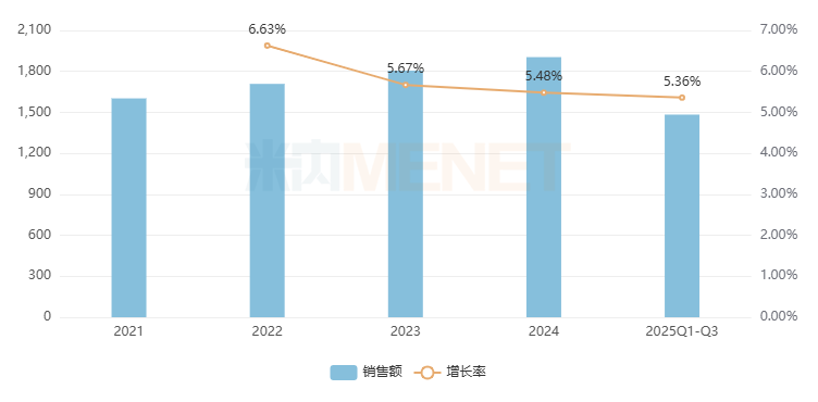 在中国城市实体药店,西药的销售规模自2016年起一路飞涨,2019年猛增13.48%,销售额快速提升至1374.8亿元,2021年大涨10.26%,销售额突破1602亿元,2023-2025年Q1-Q3以5%的增速稳步提升,2025年Q1-Q3的销售额已超过1483.7亿元。