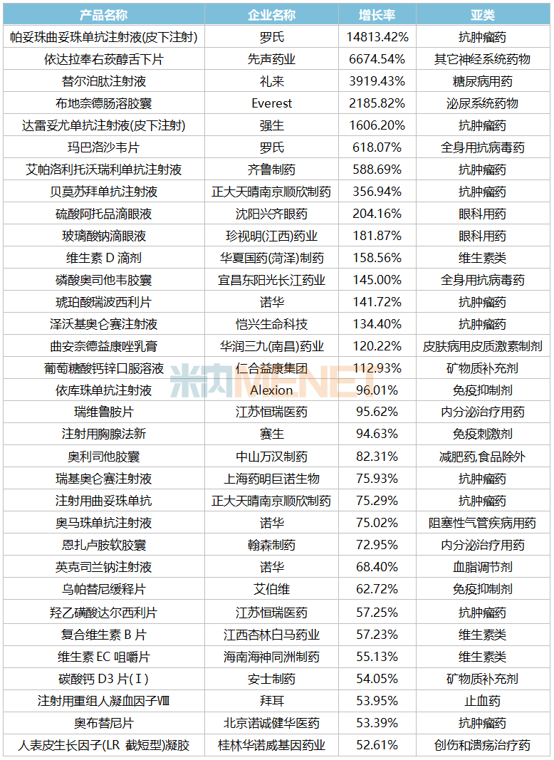 增长率在50%以上(不超过100%)的过亿西药品牌包括了江苏恒瑞医药的瑞维鲁胺片、上海药明巨诺生物的瑞基奥仑赛注射液、正大天晴南京顺欣制药的注射用曲妥珠单抗等17个。