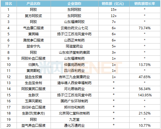 品牌TOP20中,东阿阿胶的阿胶和复方阿胶浆销售额均超过10亿元,山东福牌阿胶的阿胶、云南白药文山七花的气血康口服液、扬子江江苏龙凤堂中药的黄芪精等销售额均超过5亿元;扬子江江苏龙凤堂中药的生脉饮、河北君临药业的阿胶黄芪口服液为新上榜品牌,北京同仁堂科技制药的生脉饮(党参方)、通化万通药业的益气养血口服液重返TOP20之列。