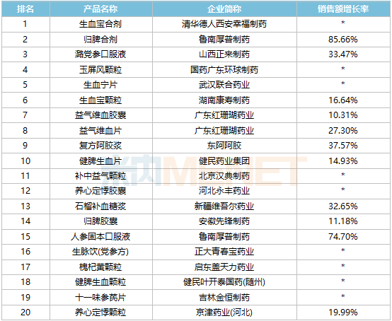 品牌TOP20中,清华德人西安幸福制药的生血宝合剂、鲁南厚普制药的归脾合剂销售额均超过5亿元,国药广东环球制药的玉屏风颗粒是唯一一个上榜的自汗用药。