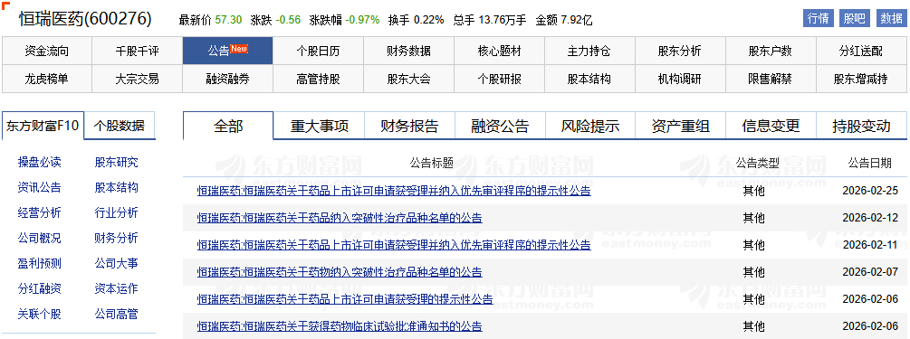 近期,恒瑞医药公告捷报频传。2月12日,其子公司苏州盛迪亚生物医药的注射用瑞康曲妥珠单抗(SHR-A1811)被CDE纳入突破性治疗品种名单,这是瑞康曲妥珠单抗第10项获得突破性治疗认证的适应症;2月11日,苏州盛迪亚生物医药收到国家药监局下发的《受理通知书》,公司注射用瑞康曲妥珠单抗的药品上市许可申请获受理,且已被纳入优先审评程序;2月7日,公司的HRS-4642注射液被CDE纳入突破性治疗品种名单。