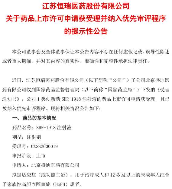 SHR-1918注射液用于治疗成人和12岁及以上的未成年人纯合子家族性高胆固醇血症(HoFH)患者。