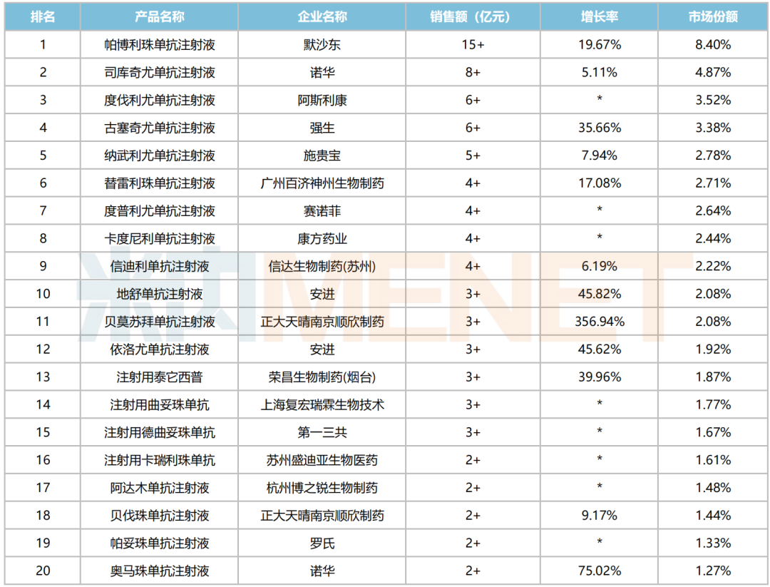 品牌TOP20方面,信达生物的信迪利单抗注射液首次攀升至第一,销售额超过40亿元;百济神州的替雷利珠单抗注射液、齐鲁制药的贝伐珠单抗注射液相继排名第二和第三,销售额均超30亿元;罗氏的注射用曲妥珠单抗、复星医药的注射用曲妥珠单抗、默克的西妥昔单抗注射液分别位列第四至第六,均为销售额超20亿元的品牌。