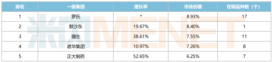 2025Q1~Q3中国零售药店终端抗体类药物一级集团格局中,一级集团TOP5分别为罗氏、默沙东、强生、诺华和正大制药。其中,正大制药是唯一上榜的本土医药集团,销售额增幅达52.65%、市场份额为6.25%。