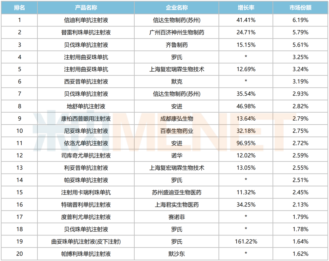 15个品牌销售额实现正增长,不乏多个国产品牌,其中信达生物的信迪利单抗注射液和贝伐珠单抗注射液分别大涨41.41%和35.54%,君实生物的特瑞普利单抗注射液、百泰生物药业的尼妥珠单抗注射液均涨逾32%,百济神州的替雷利珠单抗注射液涨超24%,齐鲁制药的贝伐珠单抗注射液增长15.15%;进口品牌有罗氏的曲妥珠单抗注射液(皮下注射)暴涨161.22%、安进的依洛尤单抗注射液和地舒单抗注射液分别大涨96.95%和46.98%等。