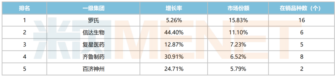 2025Q1~Q3中国公立医疗机构终端抗体类药物一级集团销售额排名中,罗氏、信达生物、复星医药、齐鲁制药、百济神州依次位列TOP5。值得一提的是,TOP5集团销售额均实现同比正增长,市场份额合计超过46%。