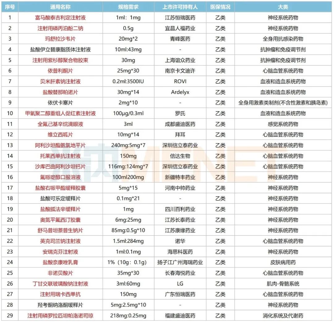 从细分品种看,此次拟进院的独家品种主要以创新药及首仿药为主,包括青峰医药的玛舒拉沙韦片、康缘药业的舒马普坦萘普生钠片、方盛制药的养血祛风止痛颗粒、以岭药业的解郁除烦胶囊等国产品牌,以及ROVI的贝米肝素钠注射液、罗氏的甲氧聚二醇重组人促红素注射液、诺华的英克司兰钠注射液等进口品牌。