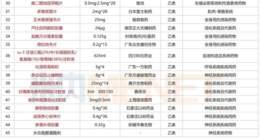 45款新药均已纳入国家医保乙类目录,除了水合氯醛灌肠剂,其余均为国谈药。从治疗大类看,主要集中在神经系统、心脑血管系统、消化系统及代谢等治疗领域。