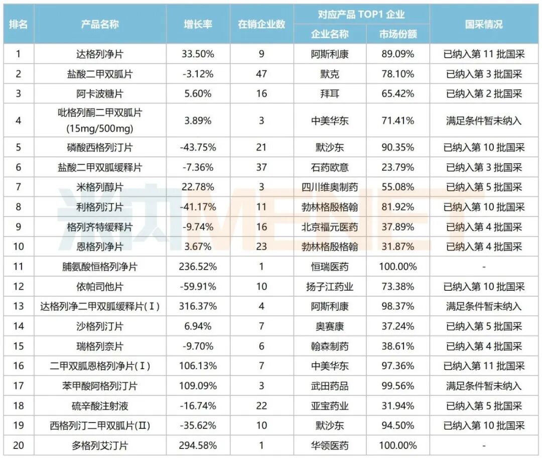 从销售额增长情况看,5个产品涨逾100%,且均首次跻身TOP20产品。其中,有4家企业在销的达格列净二甲双胍缓释片(Ⅰ)飙涨316.37%,恒瑞医药的脯氨酸恒格列净片、华领医药的多格列艾汀片2款国产1类新药均涨超200%,有7家企业在销的二甲双胍恩格列净片(Ⅰ)、有3家企业在销的苯甲酸阿格列汀片均涨超100%。