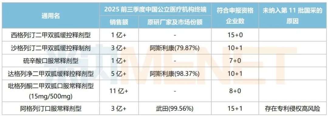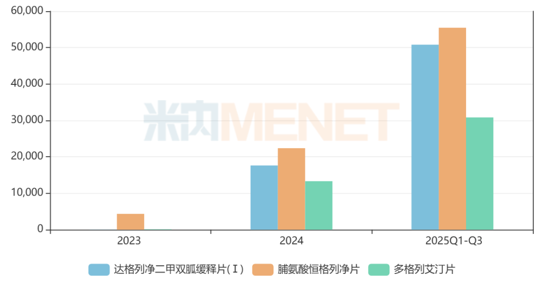 从市场规模看,6个药品2025年前三季度在中国公立医疗机构终端的销售额合计接近27亿元,其中吡格列酮二甲双胍口服常释剂型以超11亿元领跑,达格列净二甲双胍缓释控释剂型超5亿元,沙格列汀二甲双胍缓控释制剂、阿格列汀口服常释剂型均超3亿元等。