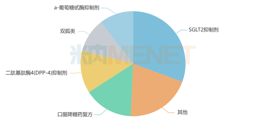糖尿病化药涵盖11个治疗小类,其中SGLT2抑制剂(格列净类产品)蝉联首位,占比由2021年的不足10%快速提升至2025年前三季度的超30%;口服降糖药复方、DPP-4抑制剂(格列汀类产品)依次位列第二、第三,市场份额均超过13%;传统类别双胍类、a-葡萄糖甙酶抑制剂分别位列第四、第五。