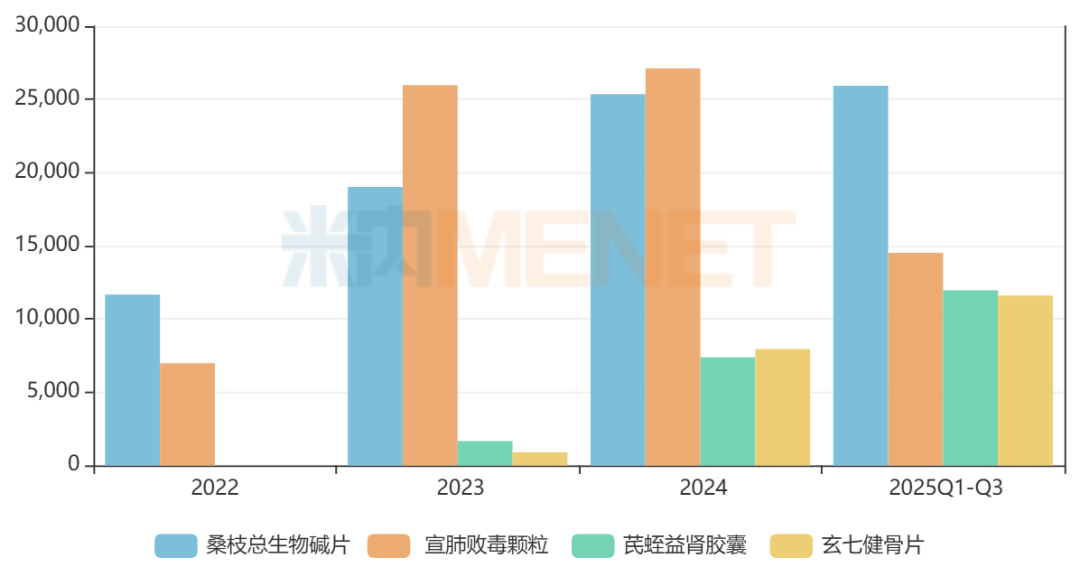 部分中药新药上市后快速放量,如北京五和博澳药业的桑枝总生物碱片、山东步长制药的宣肺败毒颗粒、山东凤凰制药的芪蛭益肾胶囊、湖南方盛制药的玄七健骨片于2020-2021年陆续获批,2025年前三季度在中国三大终端六大市场的销售额均已超过1亿元。