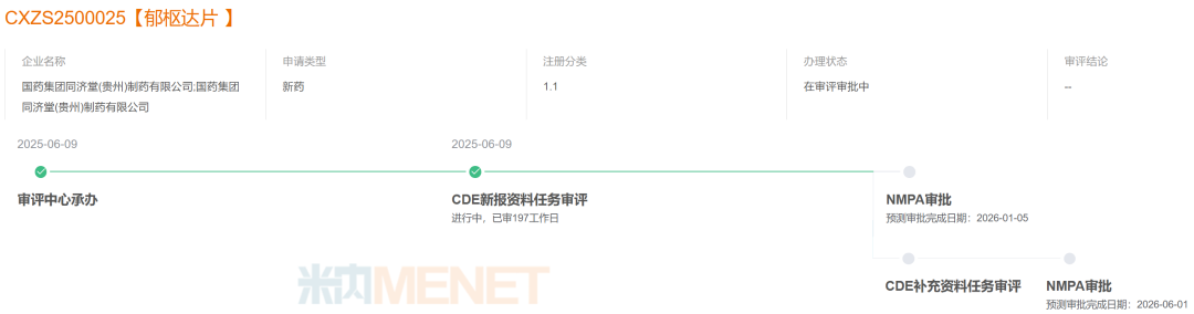 中药1.1类新药方面,郁枢达片于2025年6月提交NDA获受理,最快有望于今年下半年获批。该药具有醒脾化湿、理气解郁的功效,适用于气机郁滞所致的情绪郁闷、低落,思维迟钝,食少纳呆;抑郁障碍早期轻型症状者具有较好的疗效。