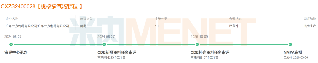 编辑说:近日,国药集团旗下广东一方制药申报的中药3.1类新药桃核承气汤颗粒获批上市,为国内第2家获批。该药源自经典名方,主治下焦蓄血证。目前国药集团已有3款经典名方中药复方制剂获批,1款中药1.1类新药、3款经典名方中药复方制剂报产在审。