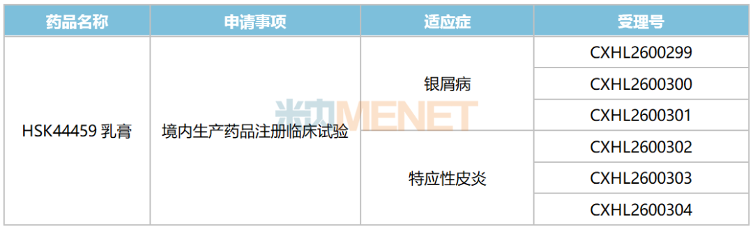 3月13日,CDE官网数据显示,海思科提交了化药1类新药HSK44459乳膏的临床申请获得承办,主要涉及银屑病和特应性皮炎两个适应症。