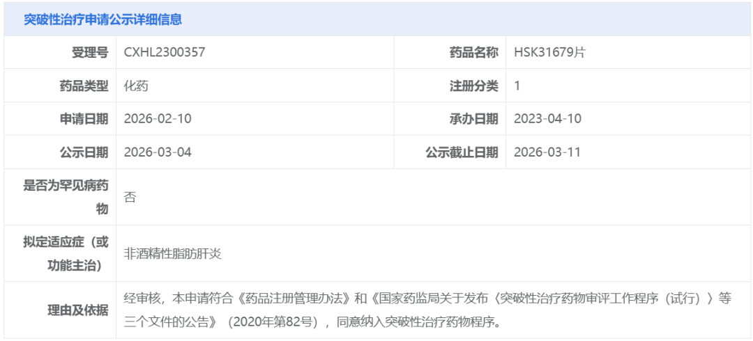 3月12日,HSK31679片正式被纳入《突破性治疗品种名单》,为国内第一个纳入突破性疗法的THR-β激动剂,国内目前尚无药物被批准用于治疗MASH(非酒精性脂肪性肝炎)。公司公告中提到,HSK31679片在纳入突破性治疗后,有望在上市申报阶段获得优先审评资格,加速推进新药上市。