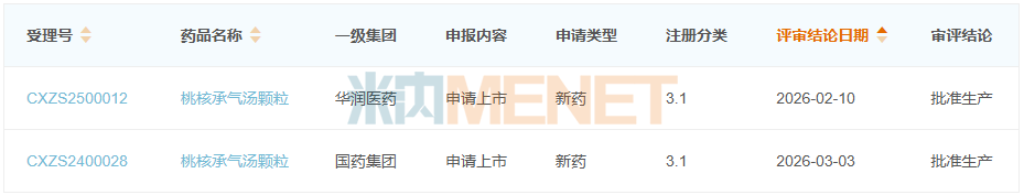 2026年2月,华润医药旗下合肥华润神鹿药业的桃核承气汤颗粒成功获批,为国内首家,随后国药集团旗下广东一方制药在3月拿下了该产品的国内第二家。