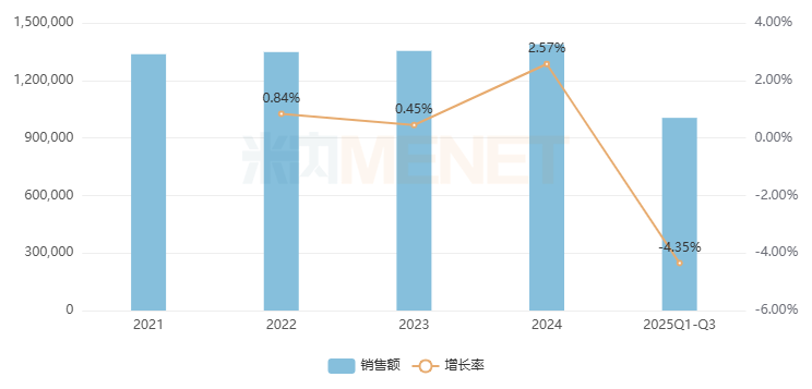 关黄母颗粒在2018年获批,2021年起进入国家医保谈判目录,限制使用范围一直没变,用于女性更年期综合征(绝经前后诸证)中医辨证属肝肾阴虚证。在中国城市公立医院、县级公立医院、城市社区中心及乡镇卫生院(简称中国公立医疗机构)终端,关黄母颗粒2022-2025年Q1-Q3连续增长了105857.34%、73.86%、33.99%、72.36%。