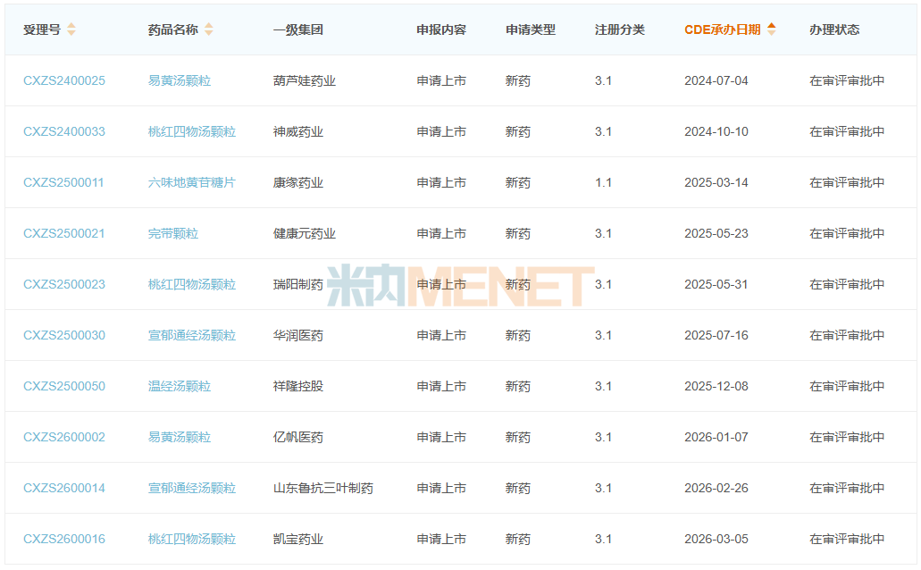 米内网数据显示,2024年至今报产在审的妇科中药新药有10个(按产品名+企业统计),其中康缘药业的六味地黄苷糖片为1.1类新药,用于治疗更年期综合征(肾阴虚证)。