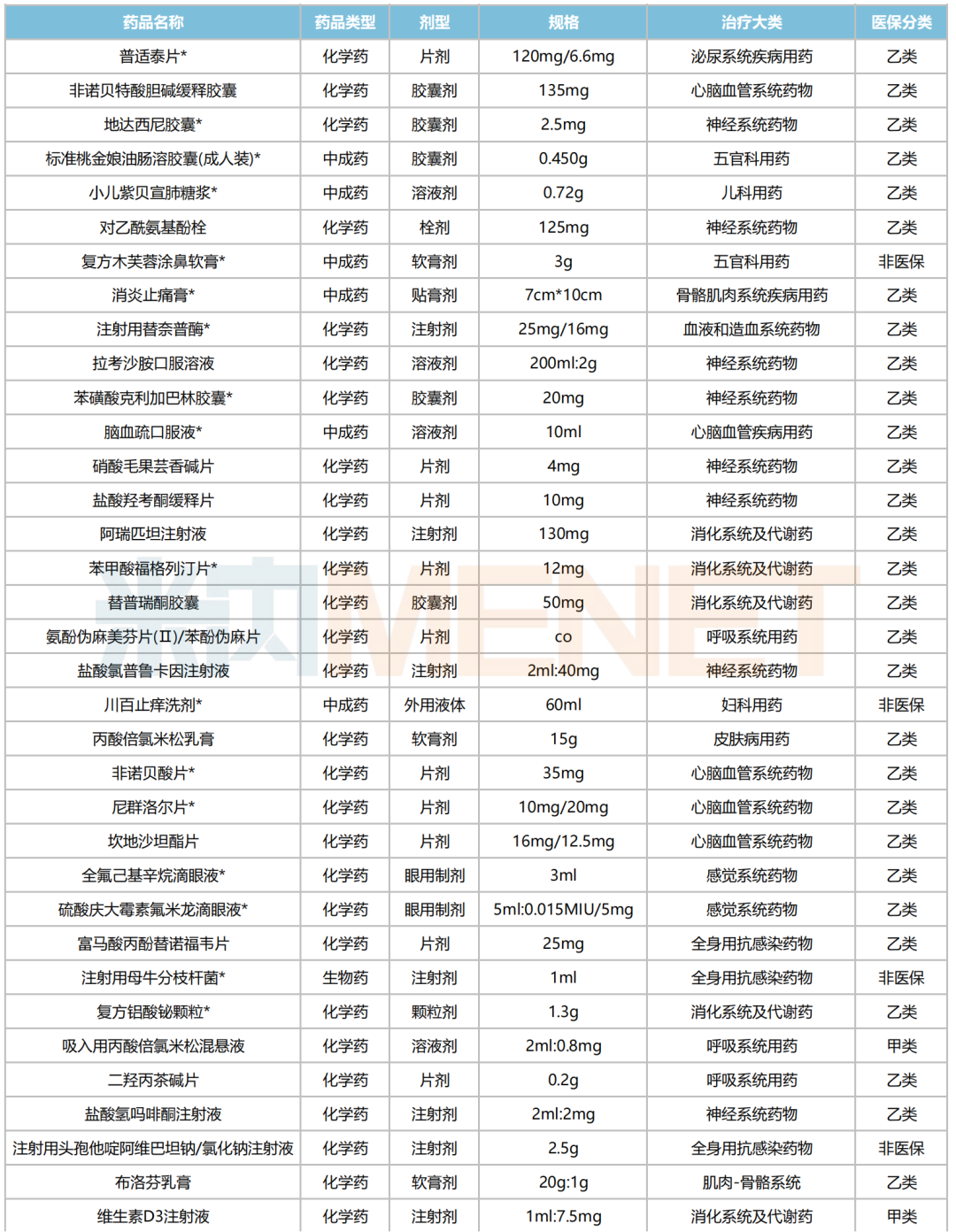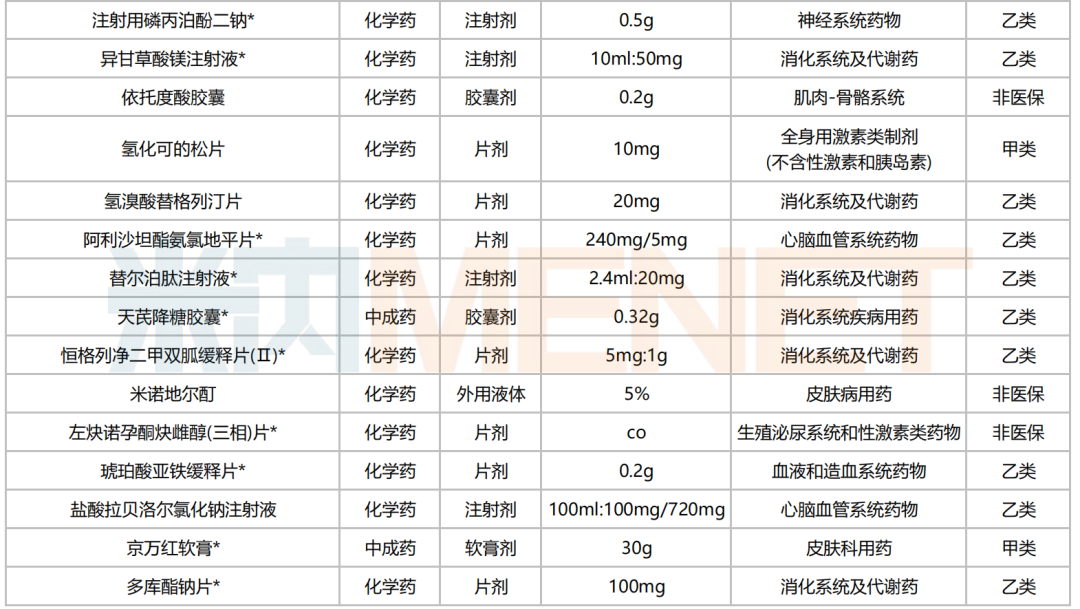 50款拟进院新药包含4款医保甲类药、39款医保乙类药和7款非医保药;按治疗大类统计,消化系统及代谢药、神经系统药物各以10个和9个产品在数量上领跑;从药品类型上看,化药、中成药、生物药分别占41个、8个和1个席位。