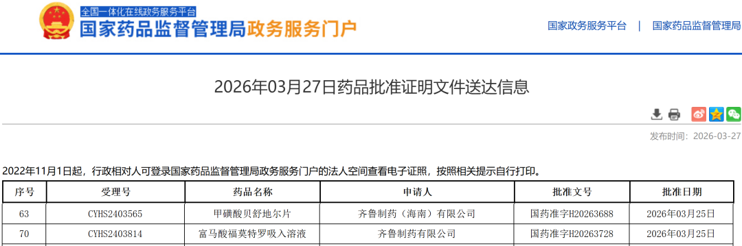 近日,国家药监局官网显示,齐鲁制药2款仿制药同日获批生产并视同过评。其中,富马酸福莫特罗吸入溶液是公司获批的首款吸入剂;甲磺酸贝舒地尔片为国内首仿 首家过评,原研产品2025年在中国三大终端六大市场(统计范围详见本文末)的销售额增速约483%。