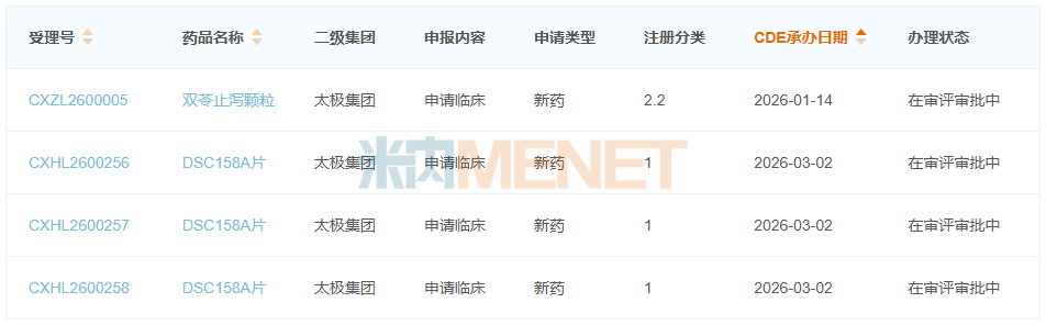 今年3月,太极集团的DSC158A片申报临床,该产品是集团布局的首款化药1类新药。