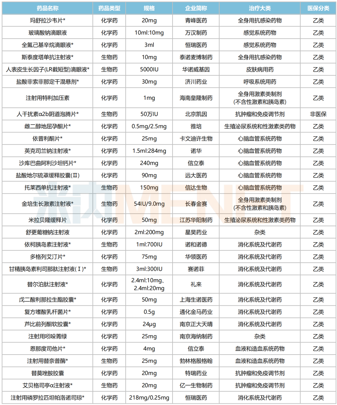 30款拟遴选进院的新药中,化药、生物药各占21个和9个席位;按治疗大类统计,消化系统及代谢药在数量上占优,有8个产品在列;医保分类方面,除人干扰素α2b阴道泡腾片外,其余均为医保乙类药。
