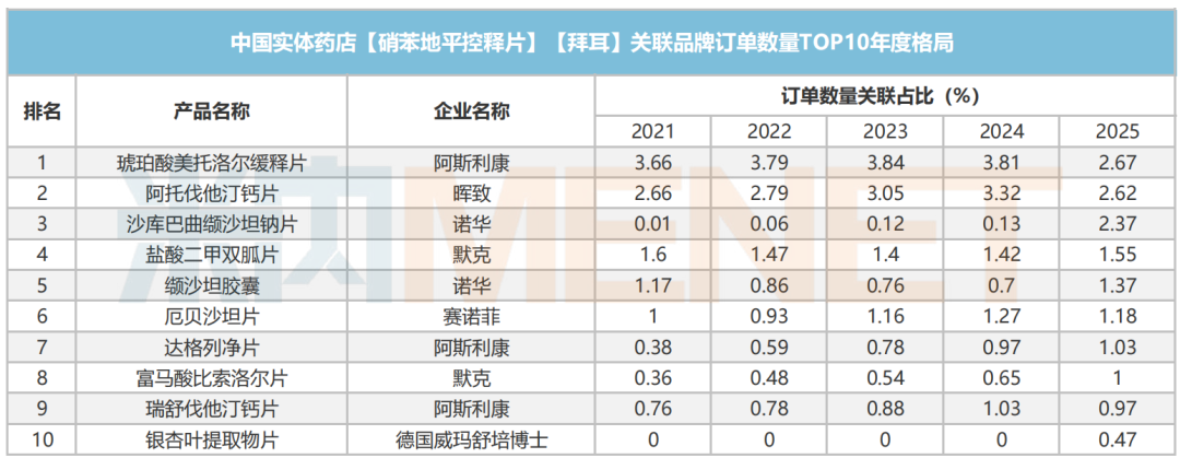 关联占比品牌从订单数量进行统计,2025年排名第一的是阿斯利康的琥珀酸美托洛尔缓释片,占比2.67%。