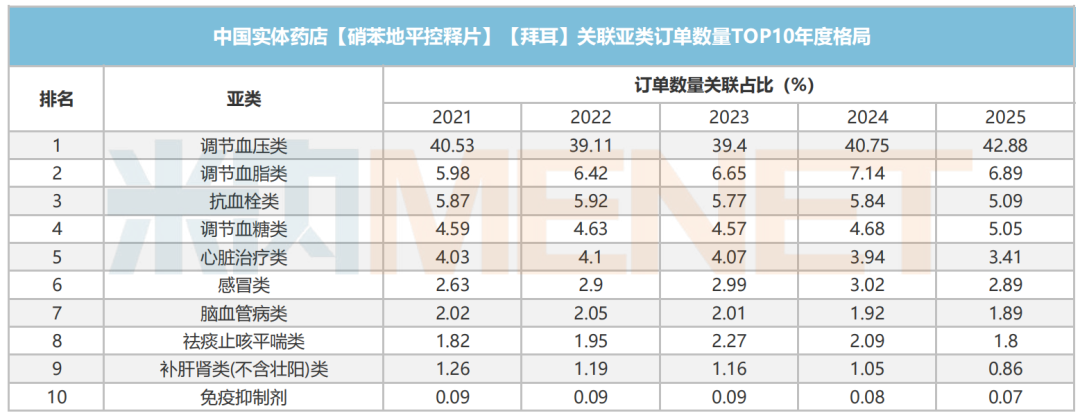 订单数量关联占比亚类方面,也是拜新同本身所在的调节血压类占比最多,2025年达42.88%,其余类别占比均低于7%。