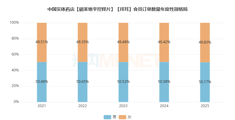 会员性别的订单数量分布方面,男性与女性的贡献度平分秋色,2025年各占50.17%和49.83%。
