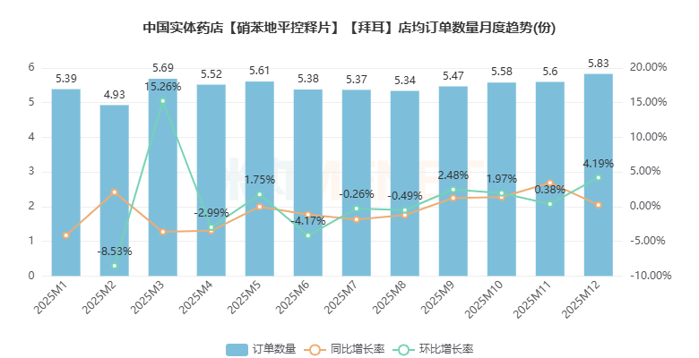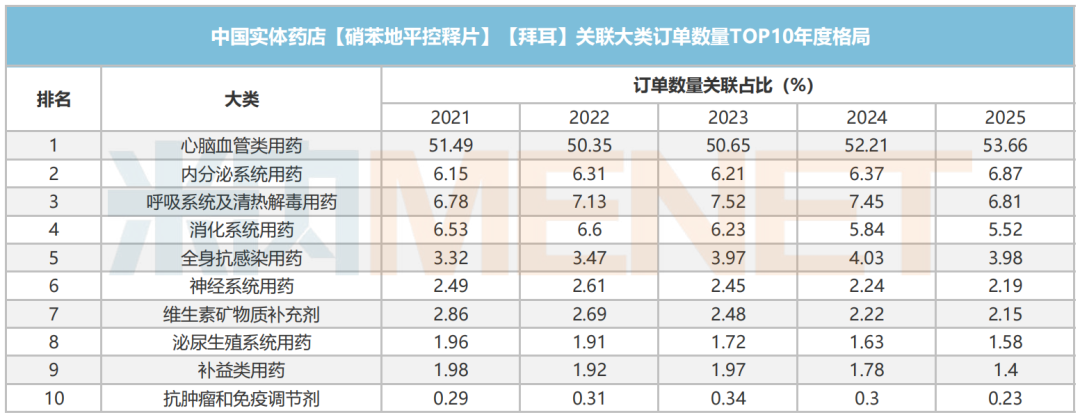 通过对不含一单一品的订单进行统计,拜新同订单数量关联占比大类还是拜新同本身所在的心脑血管类用药,2025年占比高达53.66%,内分泌系统用药、呼吸系统及清热解毒用药分别以6.87%、6.81%分列二、三位。