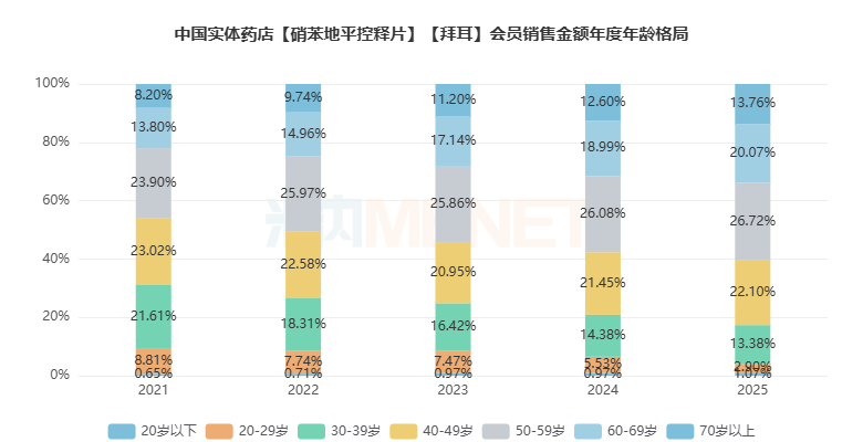 拜新同在会员年龄的销售金额分布方面,消费者年龄为“50-59岁”的群体占比最高,占26.72%。