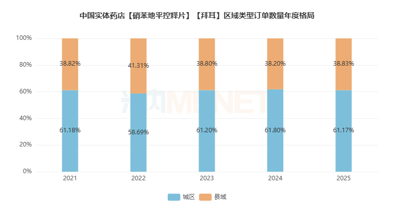 拜新同在订单数量区域类型分布方面,城区与县域占比较为稳定,2025年份额之比约为6:4。
