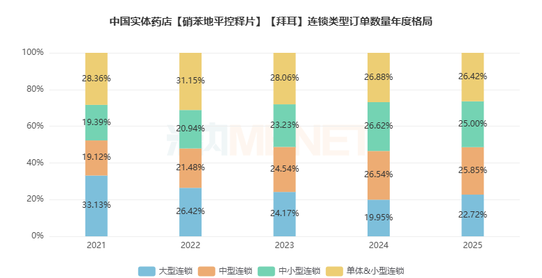 订单数量连锁类型分布方面,大型连锁、中型连锁、中小型连锁、单体&小型连锁分布比较平均,2025年占比均在22%-27%之间。