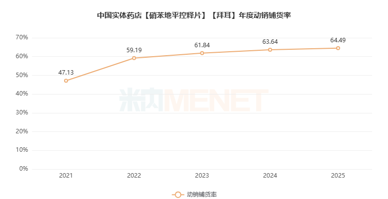 2025年拜新同的动销铺货率为64.49%,同比继续攀升。